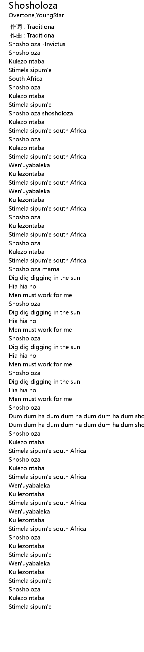 | [01:57.63] | Dum dum ha dum dum ha dum dum ha dum shosholoza |