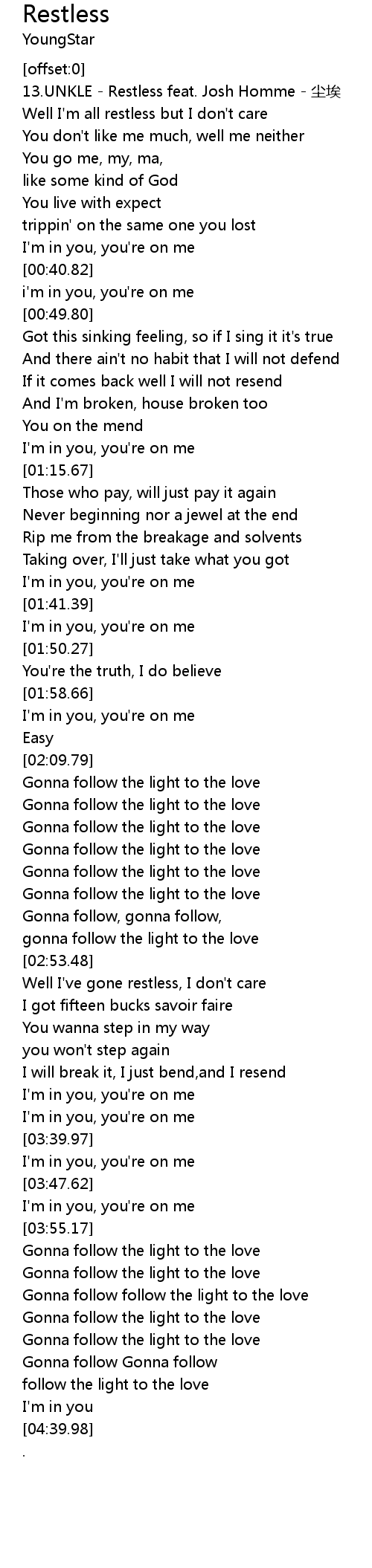 | [00:00.74] | 13.UNKLE - Restless feat. Josh Homme - 尘埃 |