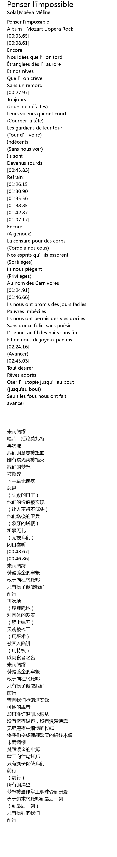 | [02:24.67][01:26.15][00:48.49] | Penser l' impossible avant tout |