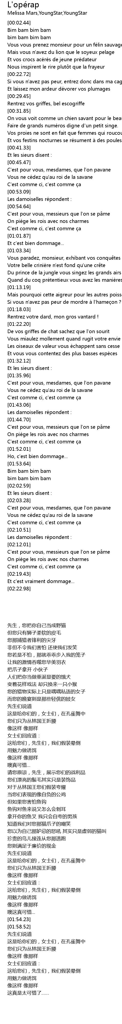 | [02:15.01] | On piège les rois avec nos charmes |