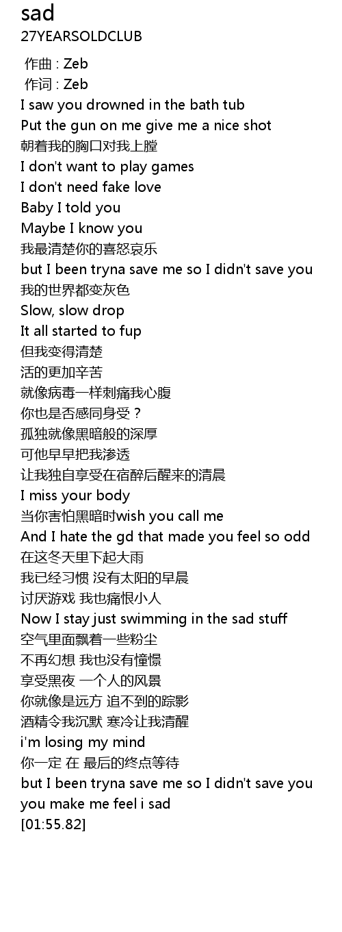| [01:33.99] | Now I stay just swimming in the sad stuff |