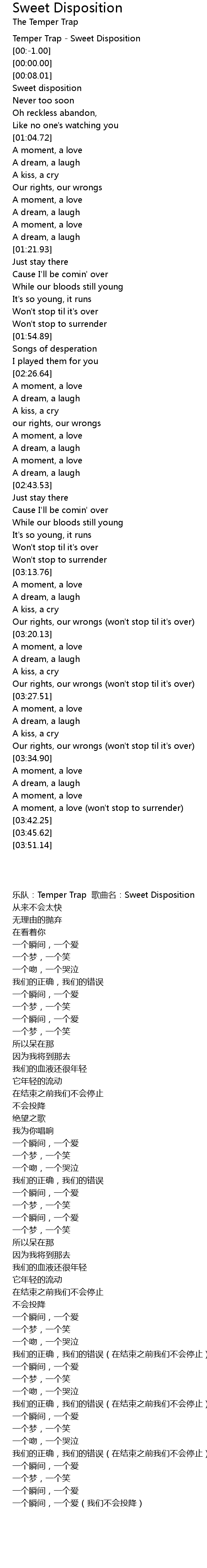 [00:-2.00] 乐队:Temper Trap 歌曲名:Sweet Disposition