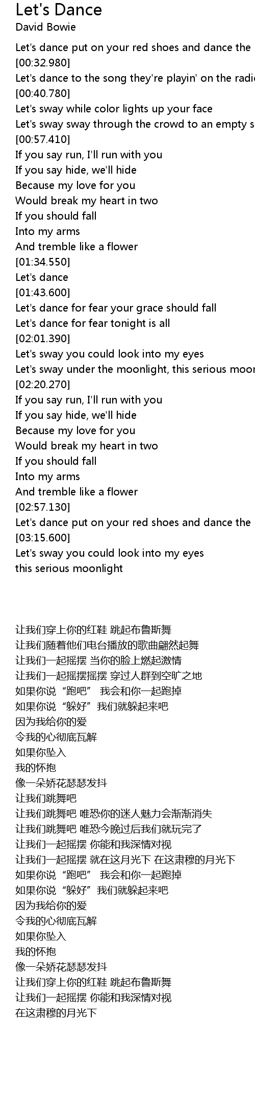 | [00:25.100] | Let's dance put on your red shoes and dance the blues |