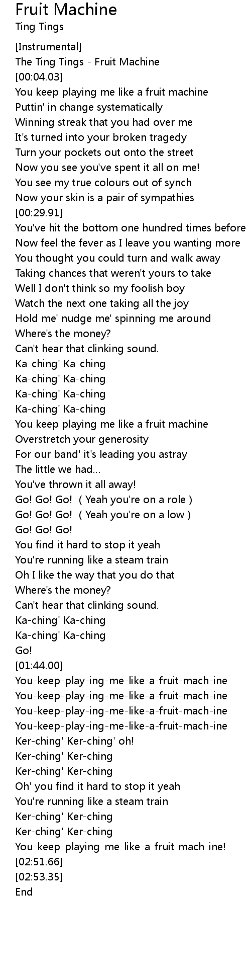 | [00:00.00] | The Ting Tings Fruit Machine |