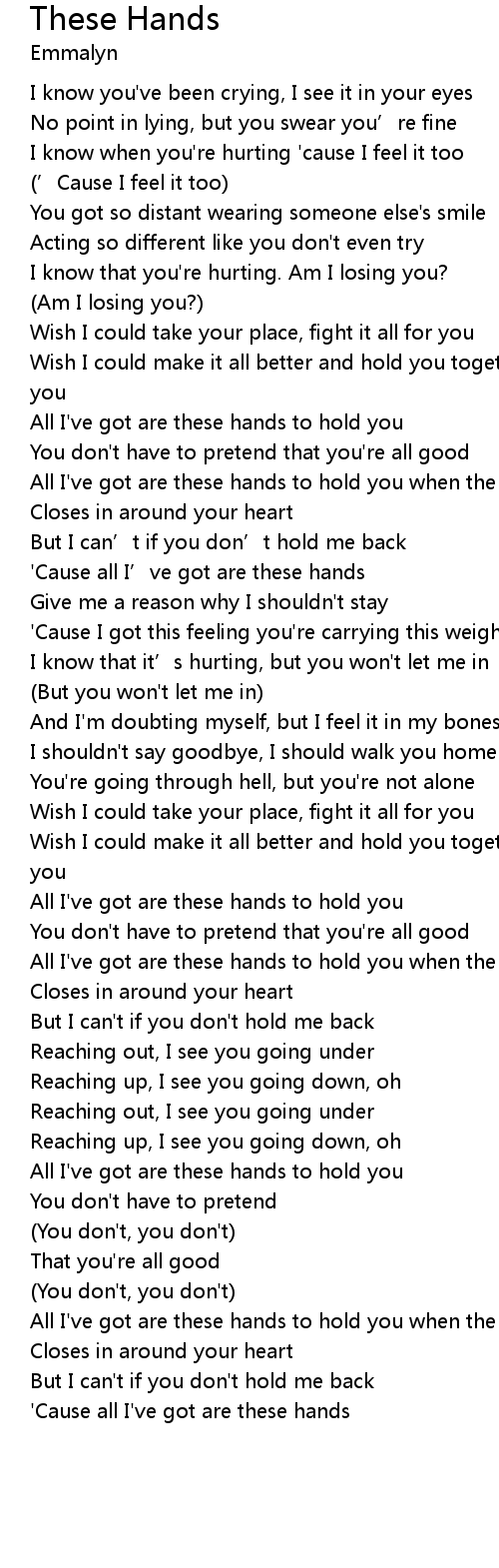 | [01:19.36] | 'Cause all I’ve got are these hands |
