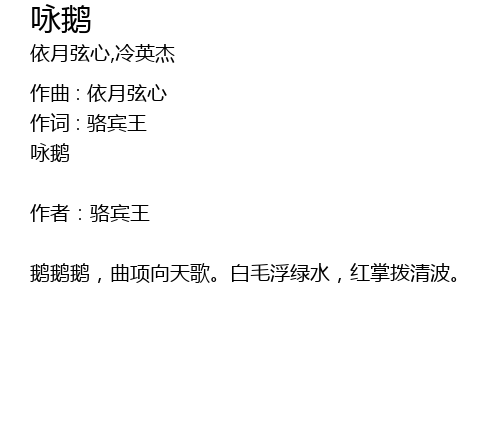 | 鹅鹅鹅,曲项向天歌。白毛浮绿水,红掌拨清波。 |