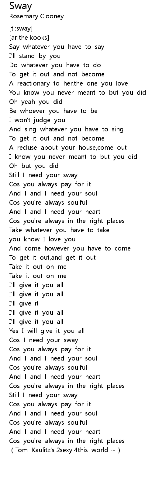 | [02:02.35] | Cos I need your sway |