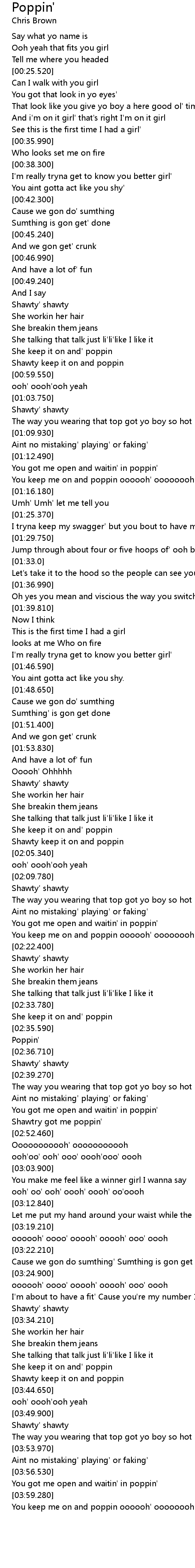 | [02:03.960] | Shawty keep it on and poppin |