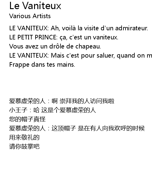| [00:22.86] | LE PETIT PRINCE: a, c' est un vaniteux. |