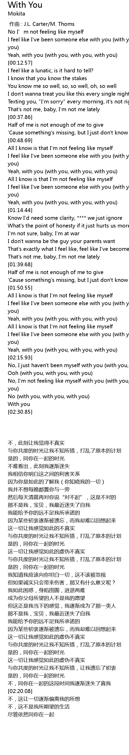 | [02:22.08] | No, I' m not feeling like myself with you with you, with you, with you |