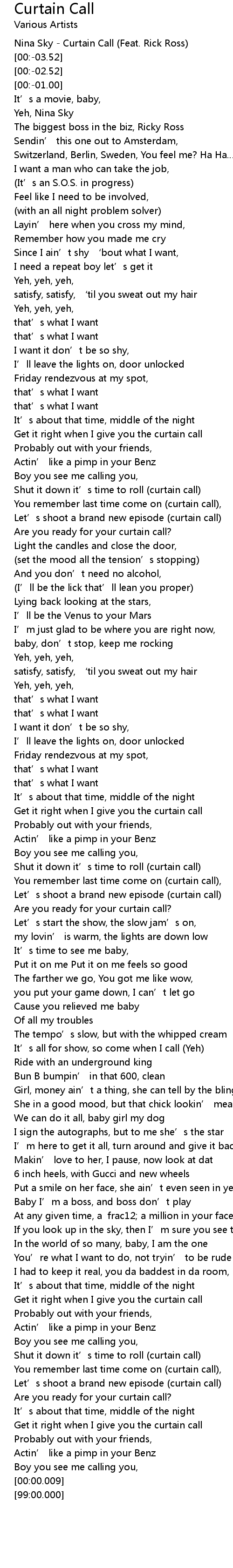 | [00:-04.52] | Nina Sky - Curtain Call (Feat. Rick Ross) |