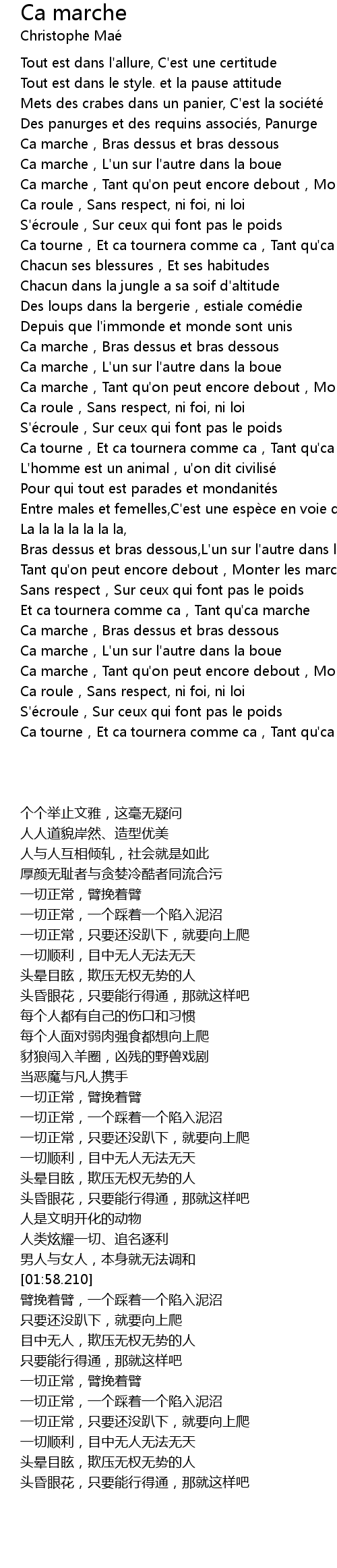 | [01:23.080] | Ca marche,L'un sur l'autre dans la boue |