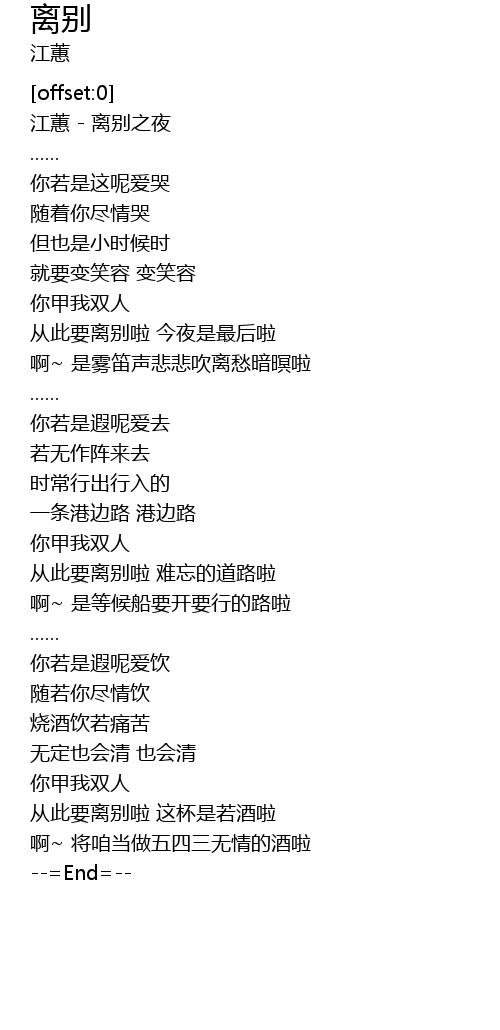 | [00:52.66] | 从此要离别啦 今夜是最后啦 |
