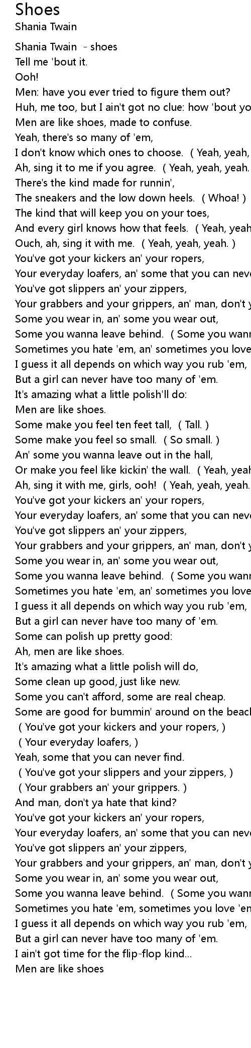 | [00:46.15] | The sneakers and the low down heels. Whoa! |