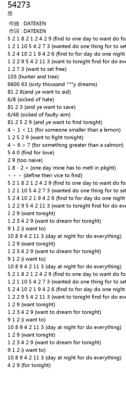 | [01:04.03] | 5 2 4 10 2 1 9 4 2 6 find to for day do one night for to think |