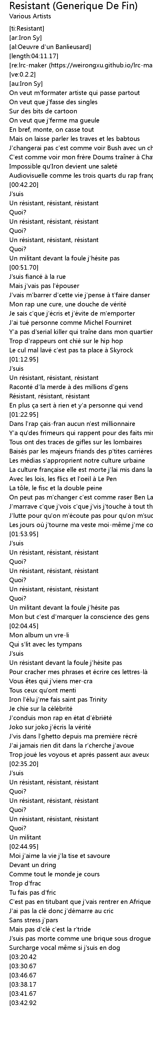 | [03:38.67][03:41.67][03:44.17] | Un ré sistant, ré sistant, ré sistant |
