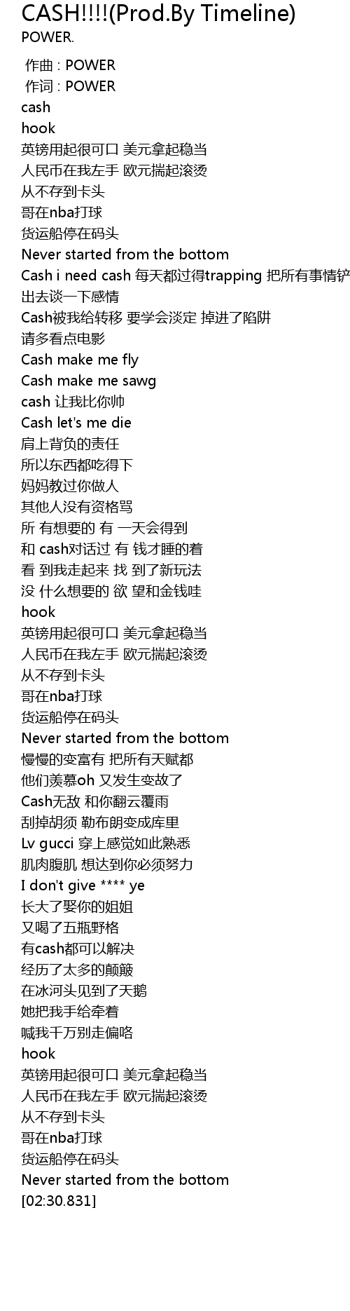 | [00:54.936] | Cash i need cash 每天都过得trapping 把所有事情铲平 出去谈一下感情 |