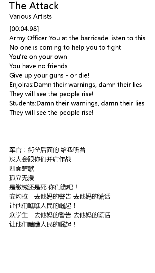 | [00:31.65] | Enjolras:Damn their warnings, damn their lies |