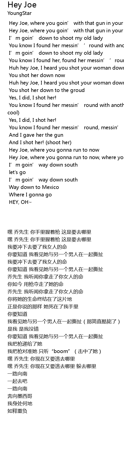 | [00:09.440] | Hey Joe, where you goin’ with that gun in your hand |