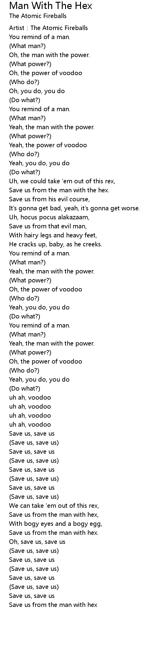 | Save us from the man with hex, | |