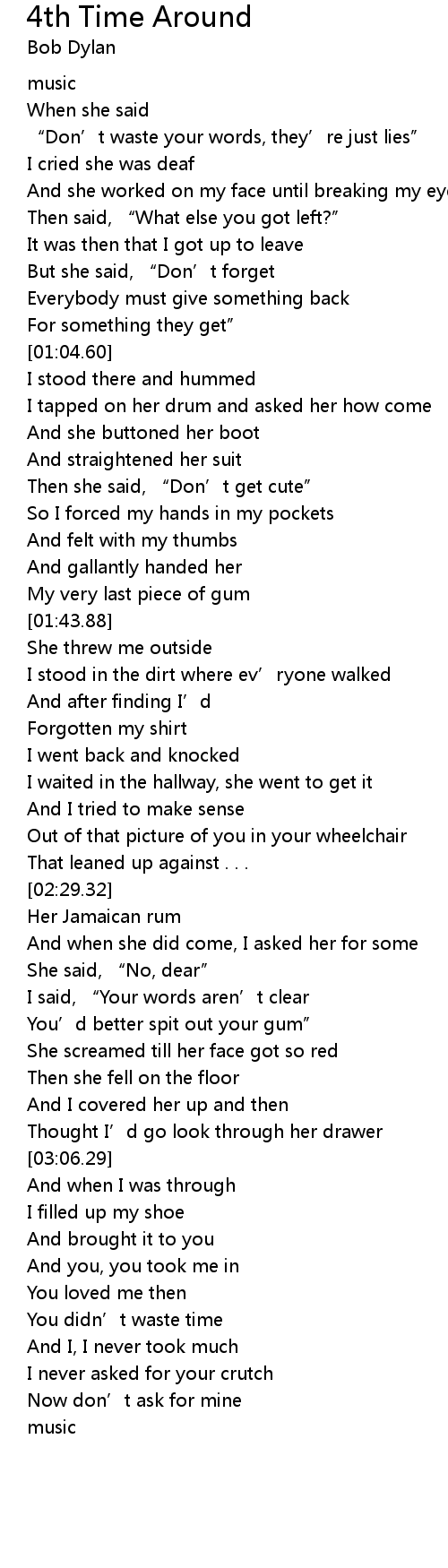 | [01:11.37] | I tapped on her drum and asked her how come |