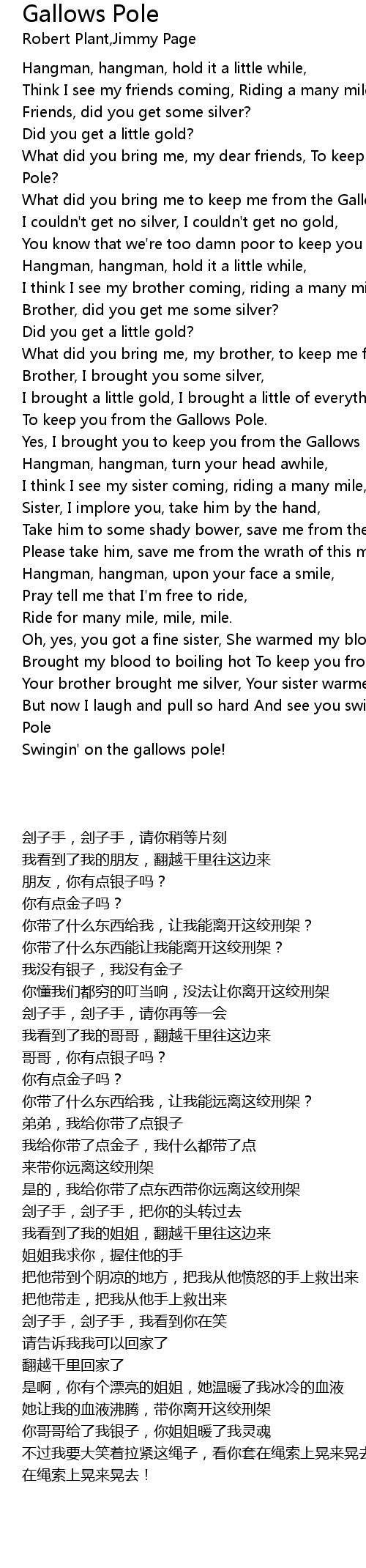 But now I laugh and pull so hard And see you swinging on the Gallows Pole |