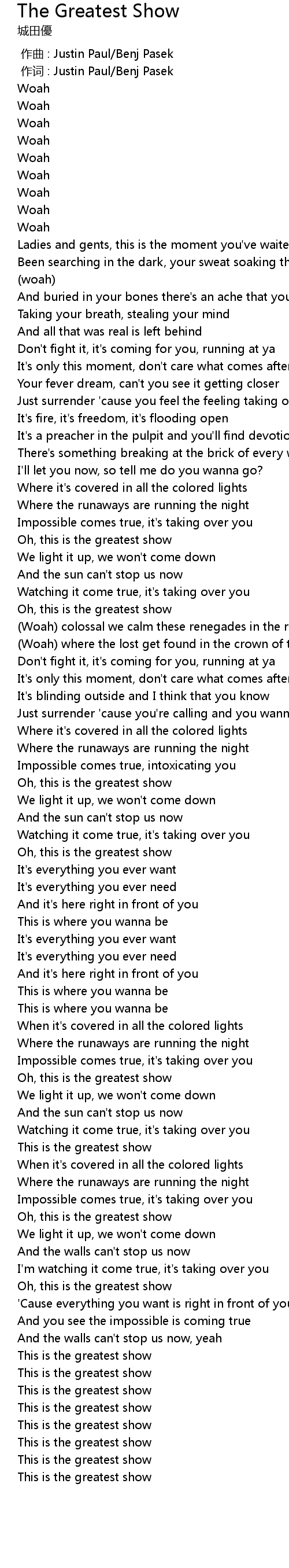 | [02:11.62] | Woah where the lost get found in the crown of the circus king |