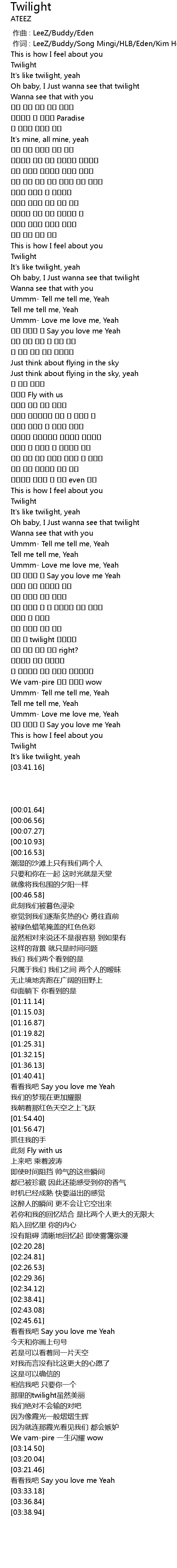 | [00:00.354] | 作词 : LeeZ/Buddy/Song Mingi/HLB/Eden/Kim Hongjoong |