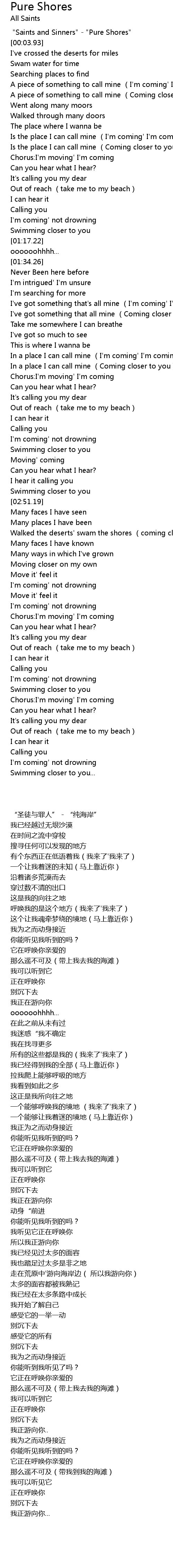 | [00:00.80] | " Saints and Sinners" " Pure Shores" |