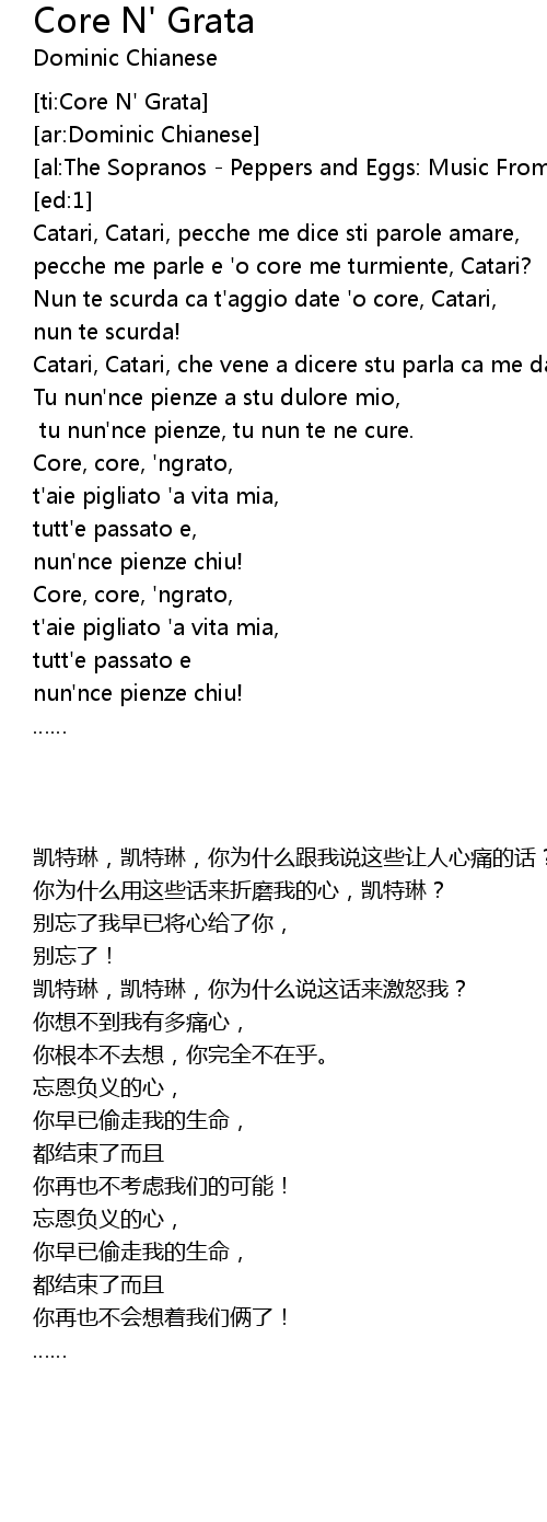 | [00:04.635] | Catari, Catari, pecche me dice sti parole amare, |