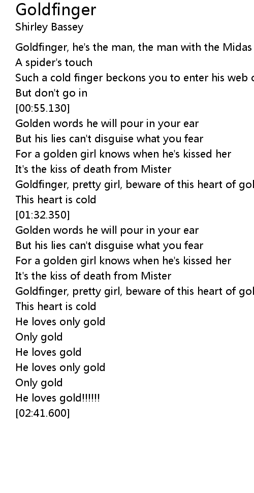 | [01:53.950] | Goldfinger, pretty girl, beware of this heart of gold |