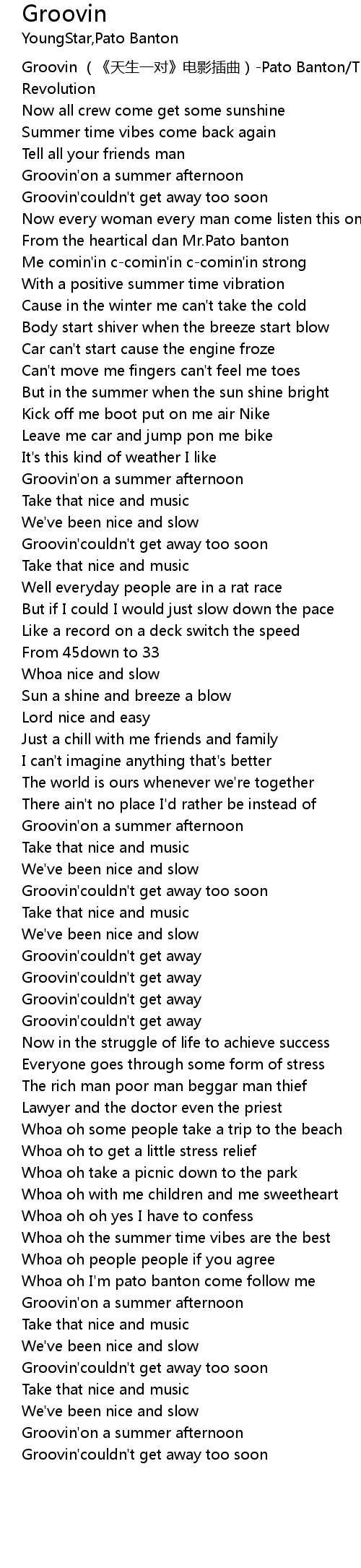 | [00:00.418] | Groovin (《天生一对》电影插曲)-Pato Banton/The Reggae Revolution |