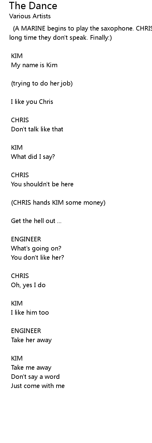 | (A MARINE begins to play the saxophone. CHRIS and KIM start to dance. For a long time they don't speak. Finally:) | |