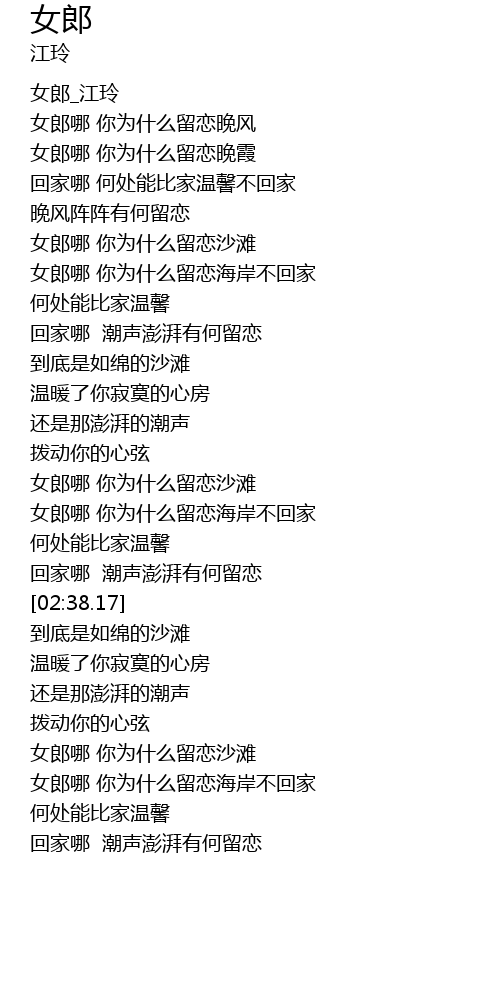 | [03:02.69] | 女郎哪 你为什么留恋海岸不回家 |