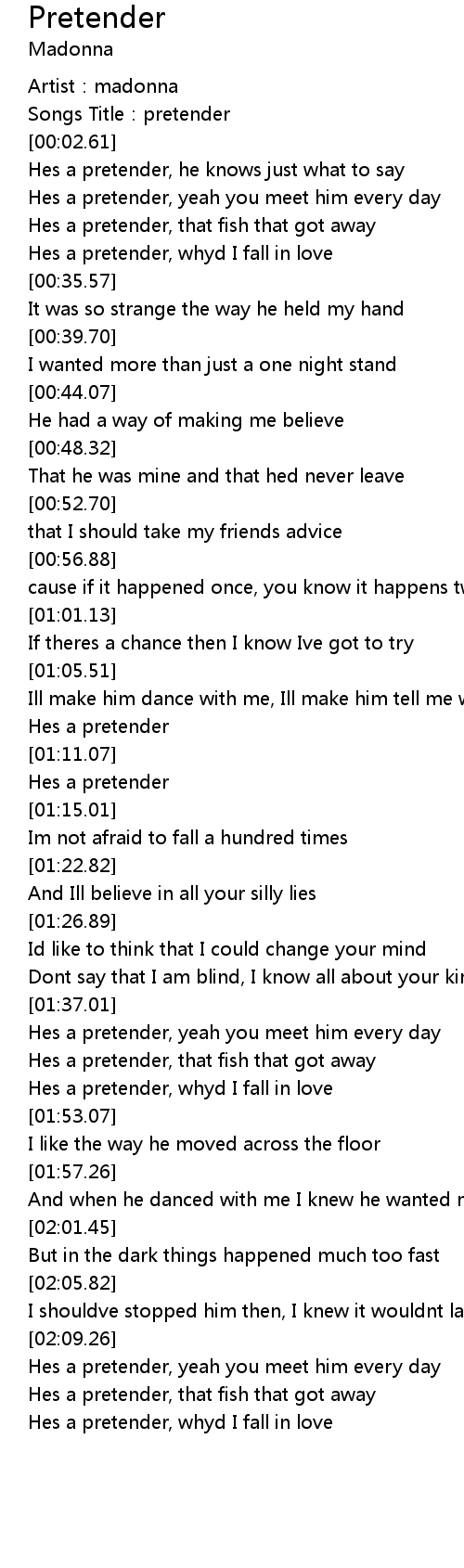 | [03:32.85] | Hes a pretender, whyd I fall in love |