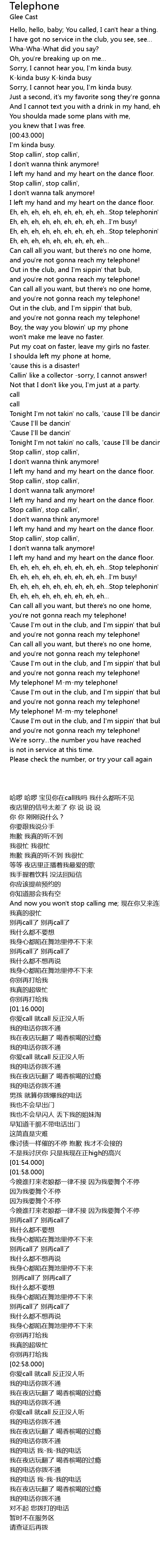 | [02:46.000] | Eh, eh, eh, eh, eh, eh, eh, eh, eh Stop telephonin' me! |