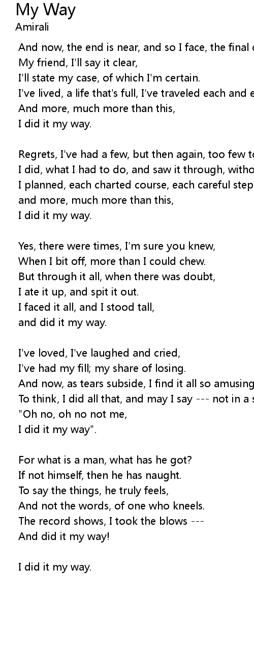 | I've lived, a life that's full, I've traveled each and every highway. | |