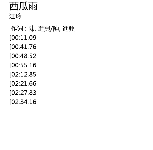 | [02:44.65][02:12.85][01:02.48] | 西瓜雨 阿 西瓜雨 |