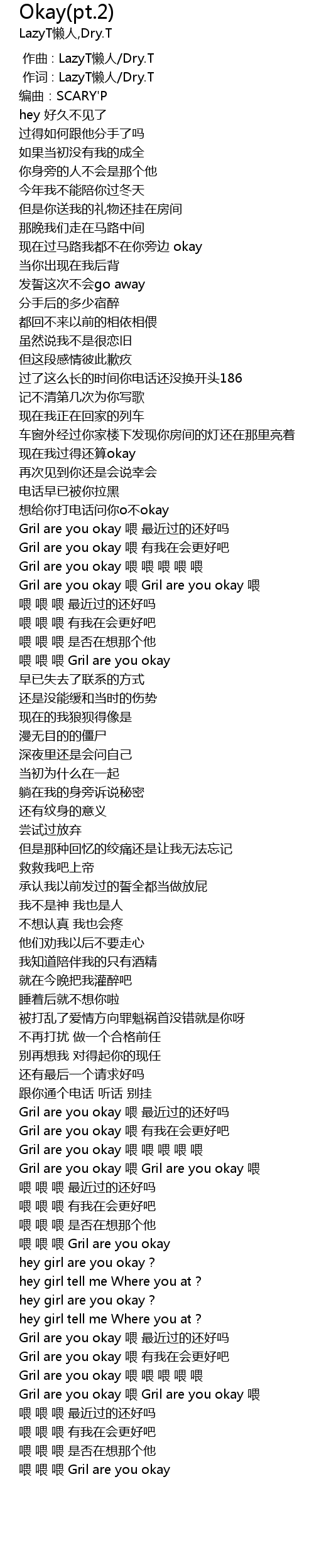 | [02:50.854] | Gril are you okay 喂 最近过的还好吗 |