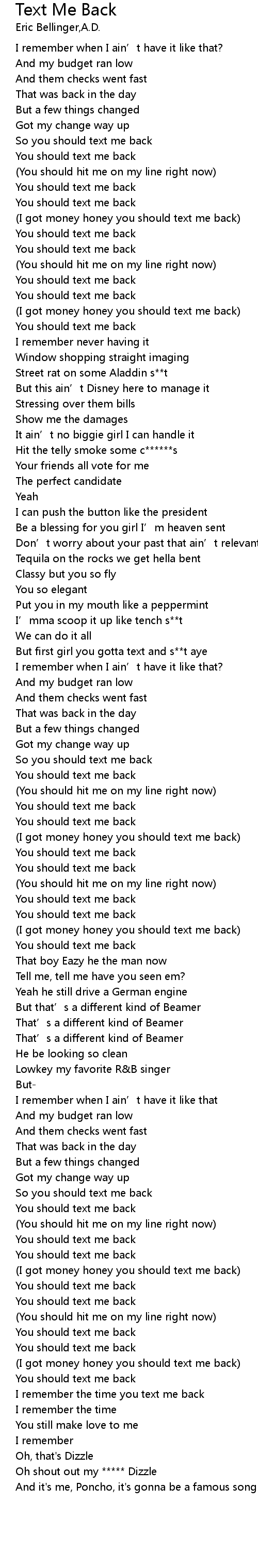 | [01:10.82] | But first girl you gotta text and s**t aye |