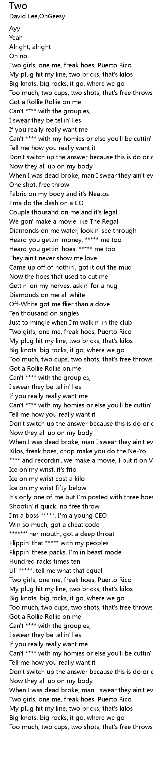 | [00:16.53] | Two girls, one me, freak hoes, Puerto Rico |