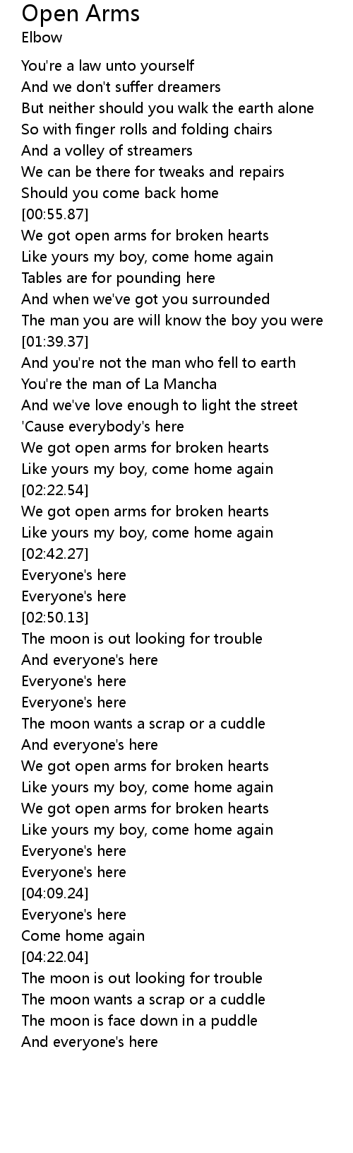We got open arms for broken hearts |