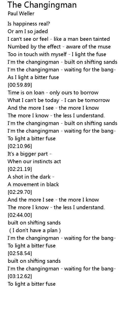 | [01:33.51] | I'm the changingman - built on shifting sands |