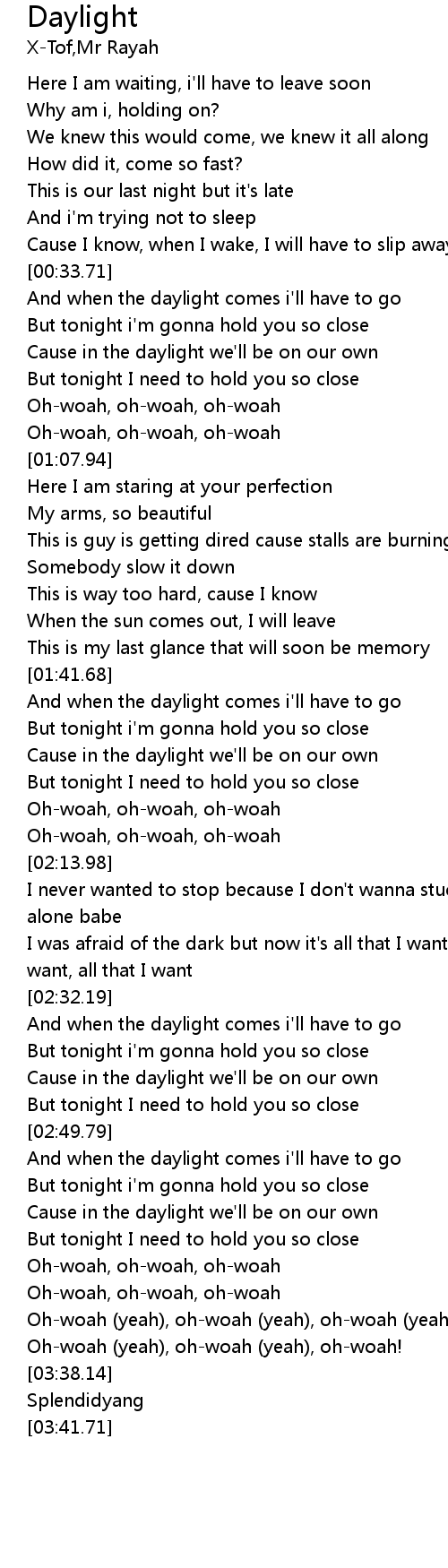 | [02:34.01] | And when the daylight comes i'll have to go |