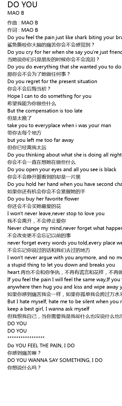 | ru guo ni gan dao tong ku wo hui yi yang, ru guo ni gu dan wo hui kua guo wan shui lai zhao ni bao zhu ni qin wen ca qu ni yan jiao lei shui | |