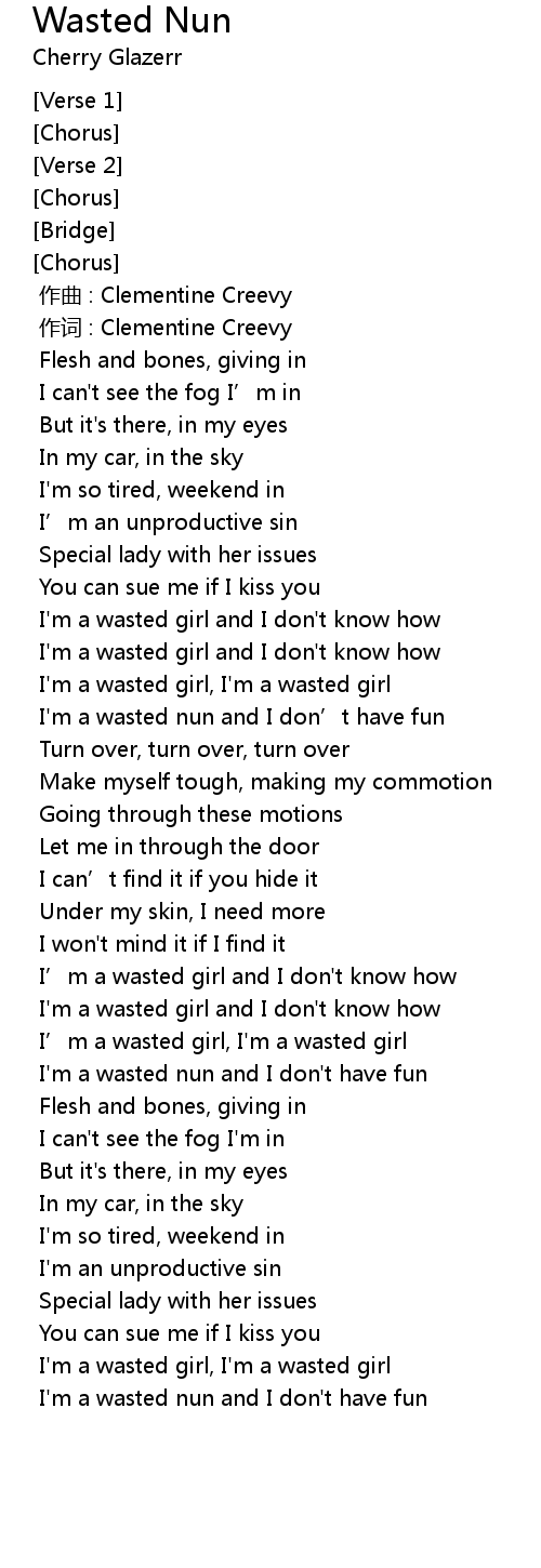 | [01:05.909] | I' m a wasted nun and I don' t have fun |