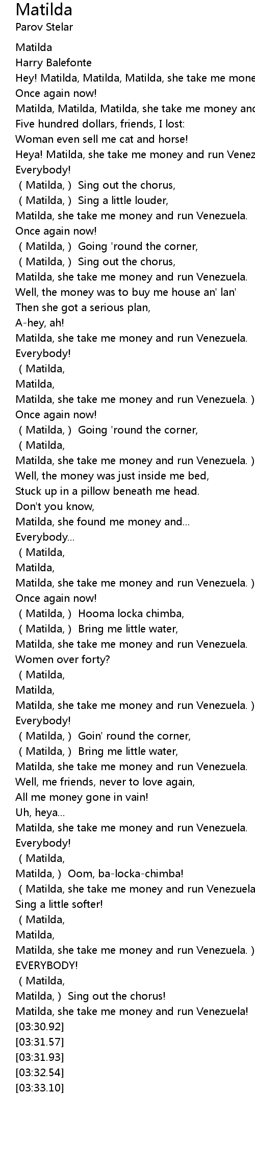 | [02:33.37] | Matilda, she take me money and run Venezuela. |