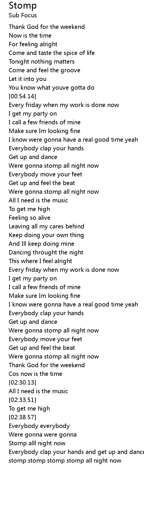 | [02:56.60] | Everybody clap your hands and get up and dance were gonna stomp stomp stomp stomp stomp stomp all night now |