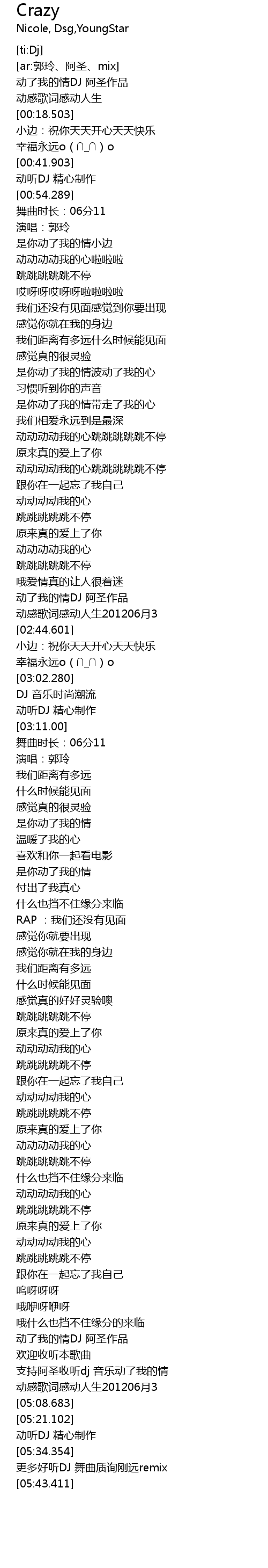 | [05:37.251] | geng duo hao ting DJ wu qu zhi xun gang yuan remix |