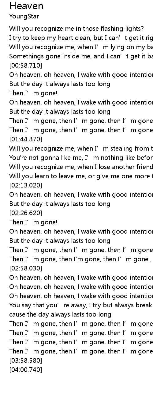 | [02:59.120] | Oh heaven, oh heaven, I wake with good intentions, |